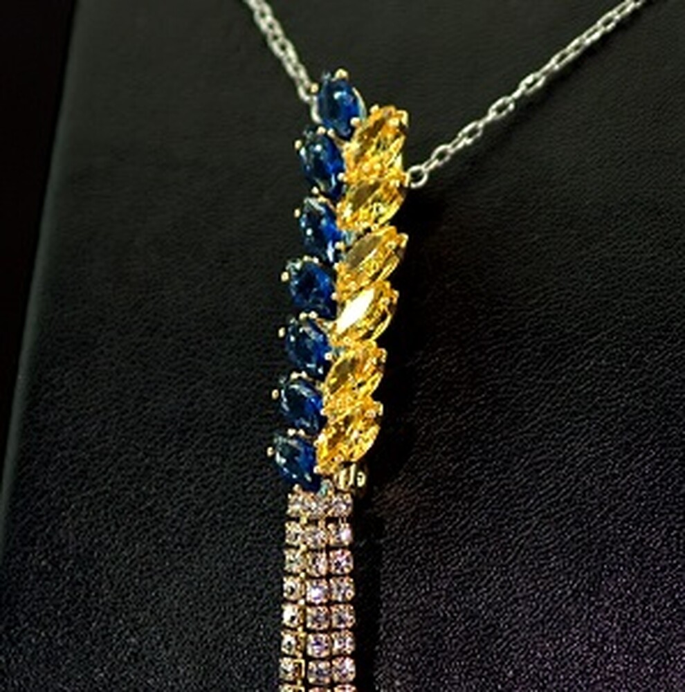 Брошка в позолоте з желтыми, синими та белыми фианитами
