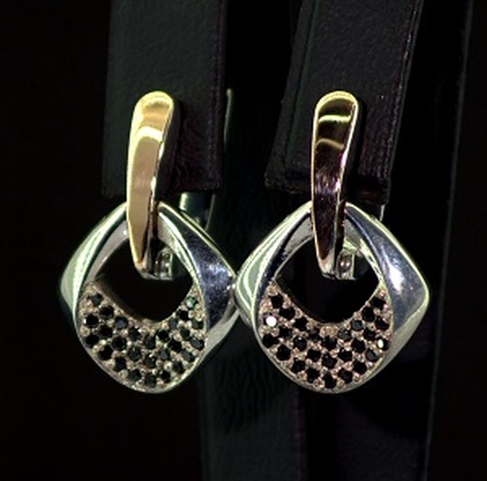 Серебряные серьги 925 пробы с позолотой 375 пробы 6,65 г с черными Фианитами 0,95 карат
