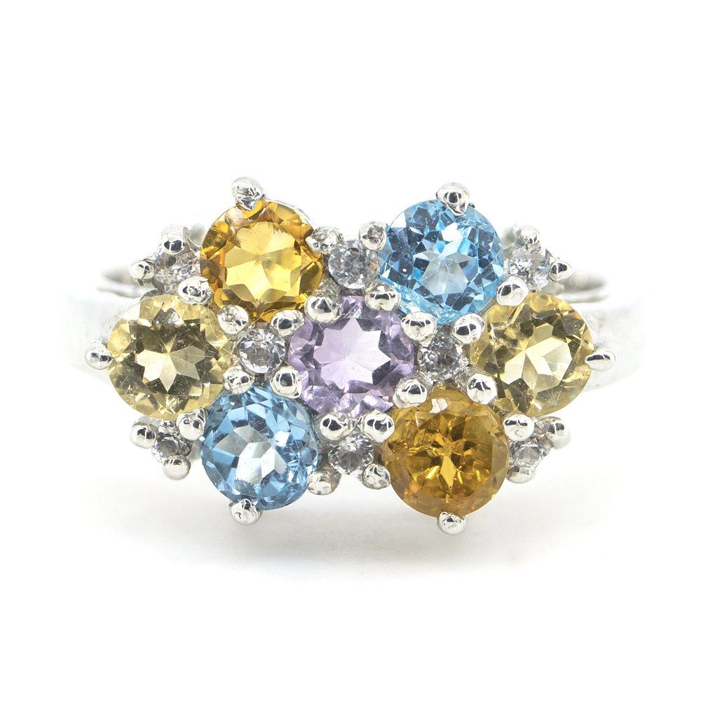 Серебряное кольцо 925 пробы 5,4 г с бразильским аметистом, швейцарским топазом, цитрином из США, Мадейра цитрином из Мадагаскара 1,64 карат