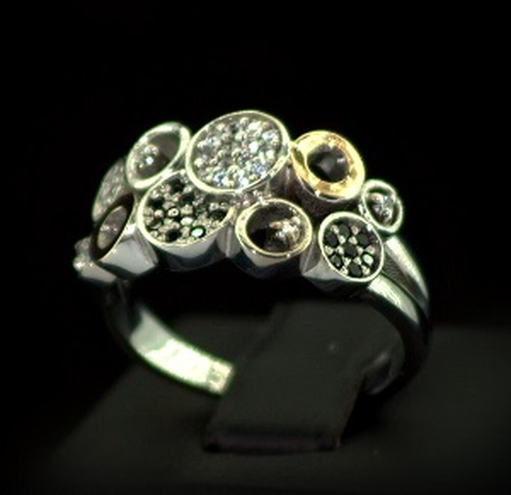 Серебряное кольцо 925 пробы с позолотой 375 пробы 6,01 г с черными та белыми Фианитами 0,8 карат