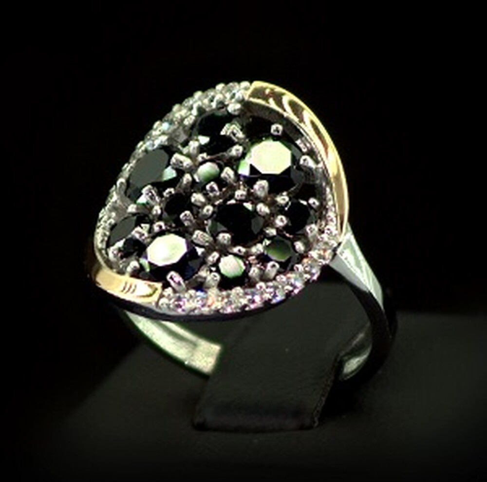 Серебряное кольцо 925 пробы с позолотой 375 пробы 4,88 г с черными та белыми Фианитами 2,6 карат
