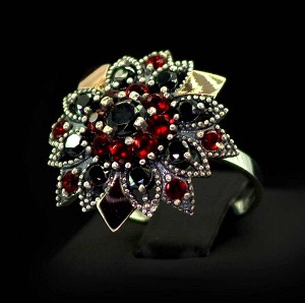 Серебряное кольцо 925 пробы с позолотой 375 пробы 6,77 г с красными та черными Фианитами 4,75 карат