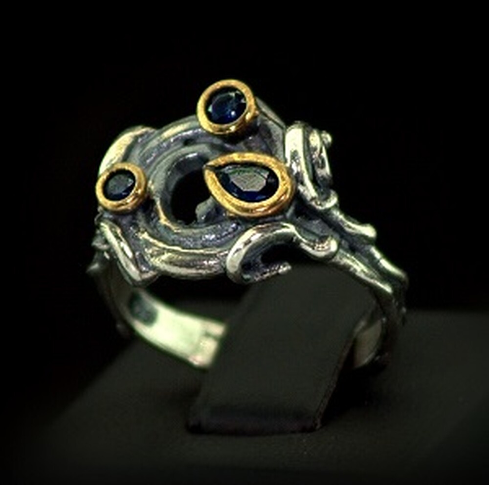 Серебряное кольцо ручної роботи 925 пробы 5,38 г с синими цирконами 0,97 карат