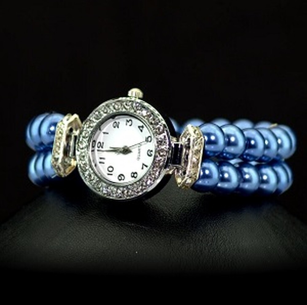 Кварцевий женский часы с синими Перлинами (імітація) и фианитами