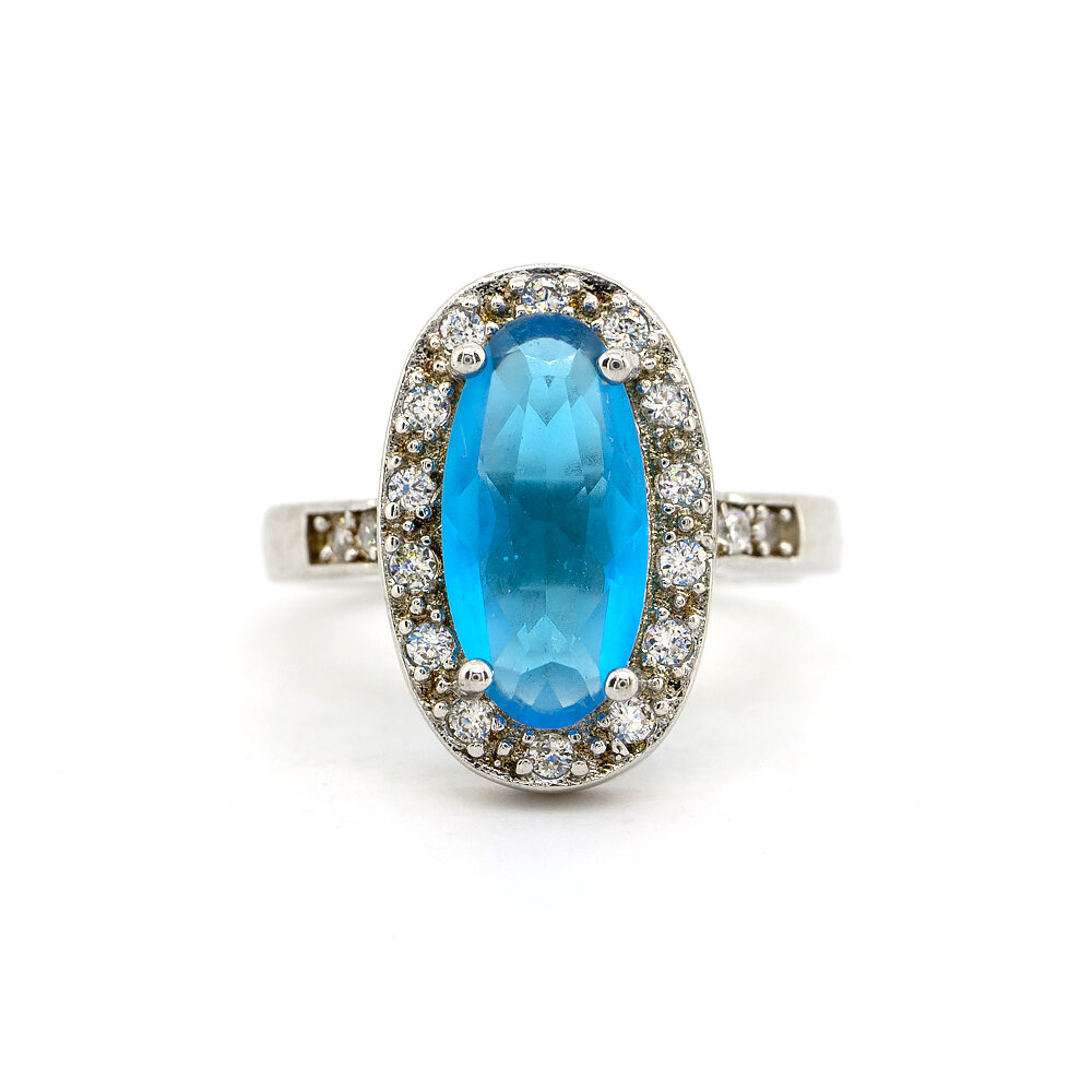 Каблучка з платиновим покриттям 850 проби з блакитним кристалом