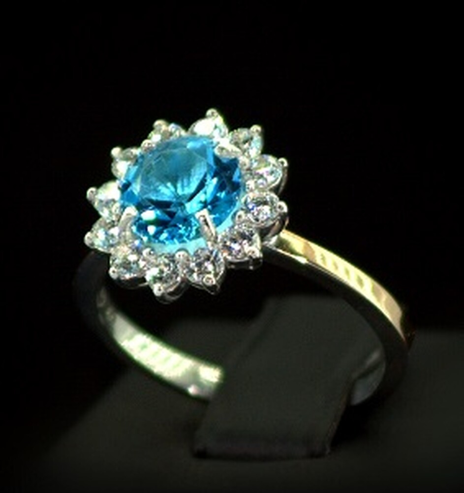 Срібна каблучка 925 проби з позолотою 375 проби 4,91 г з блакитним та білими Фіанітами 5 карат