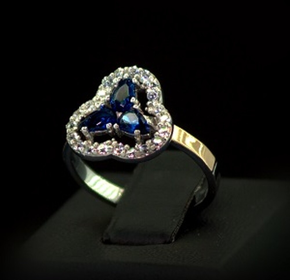 Срібна каблучка 925 проби з позолотою 375 проби 2,75 г з синіми та білими Фіанітами 1,55 карат