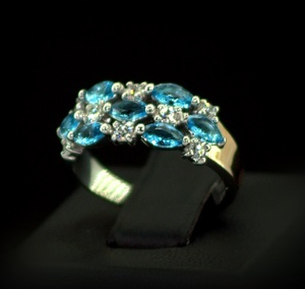 Срібна каблучка 925 проби з позолотою 375 проби 3,03 г з блакитними та білими Фіанітами 2,25 карат